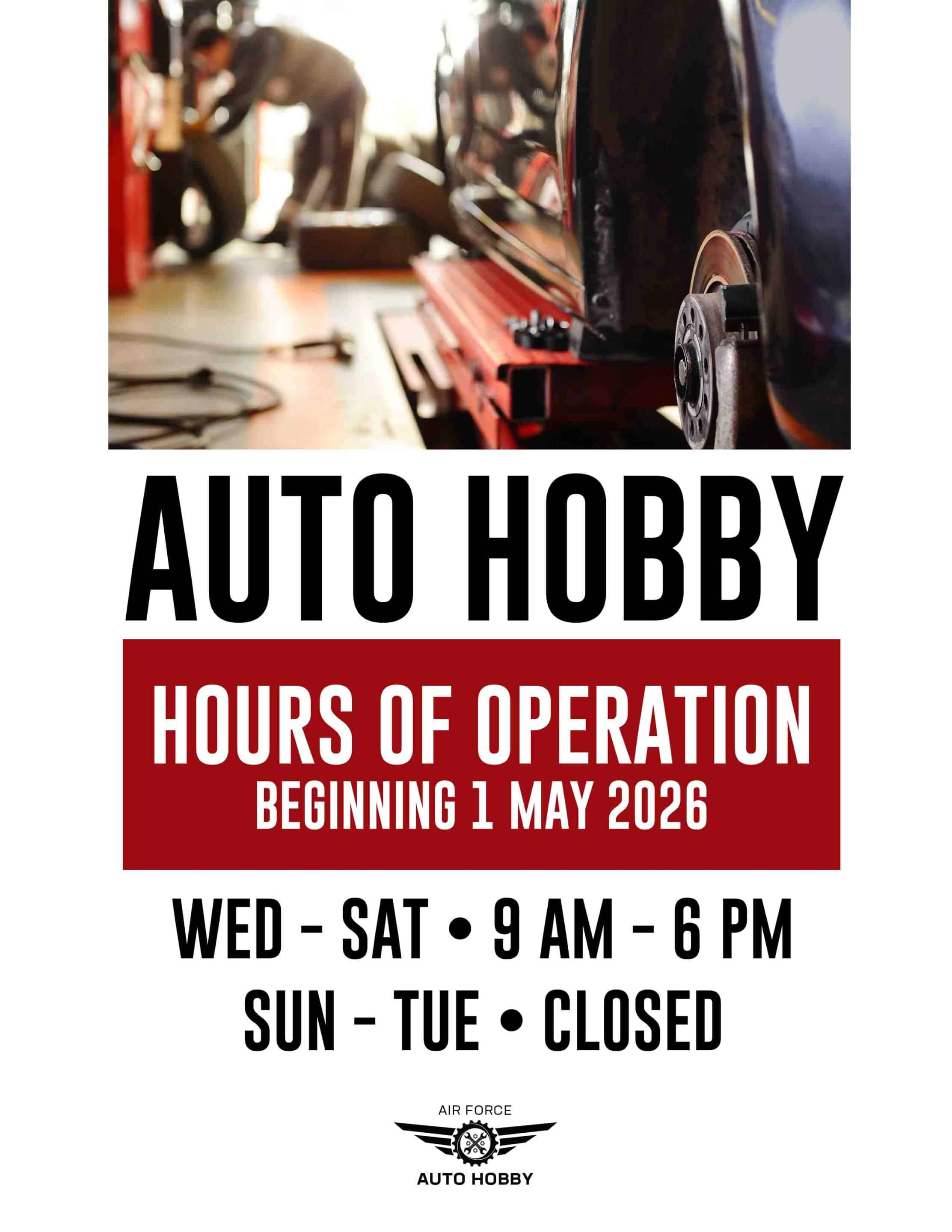 Starting May 1, Auto Hobby will have new hours of operation: