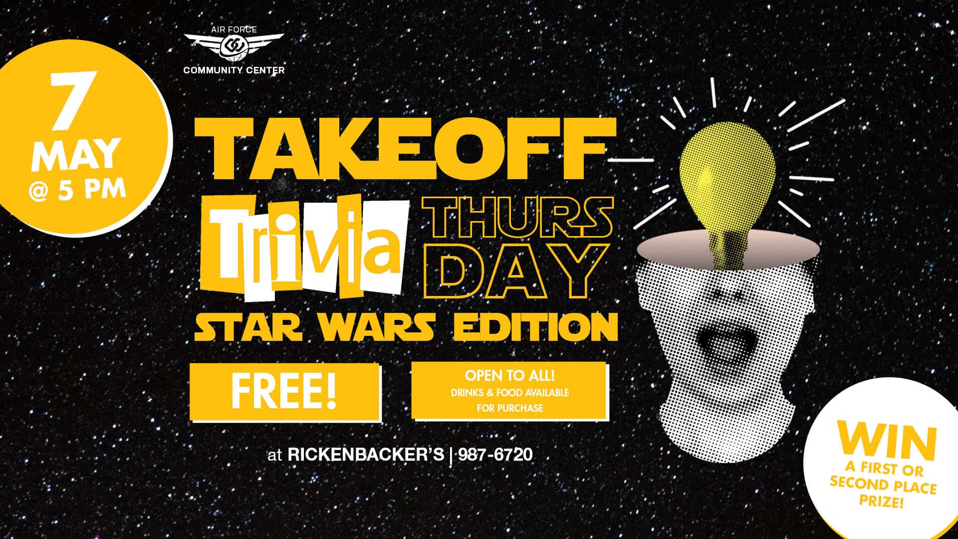 Join us at Rickenbacker’s (inside the Air Force Inn) for Take Off Trivia Thursday! Bring your brainpower, grab a drink, and get ready for a fast-paced night of fun.