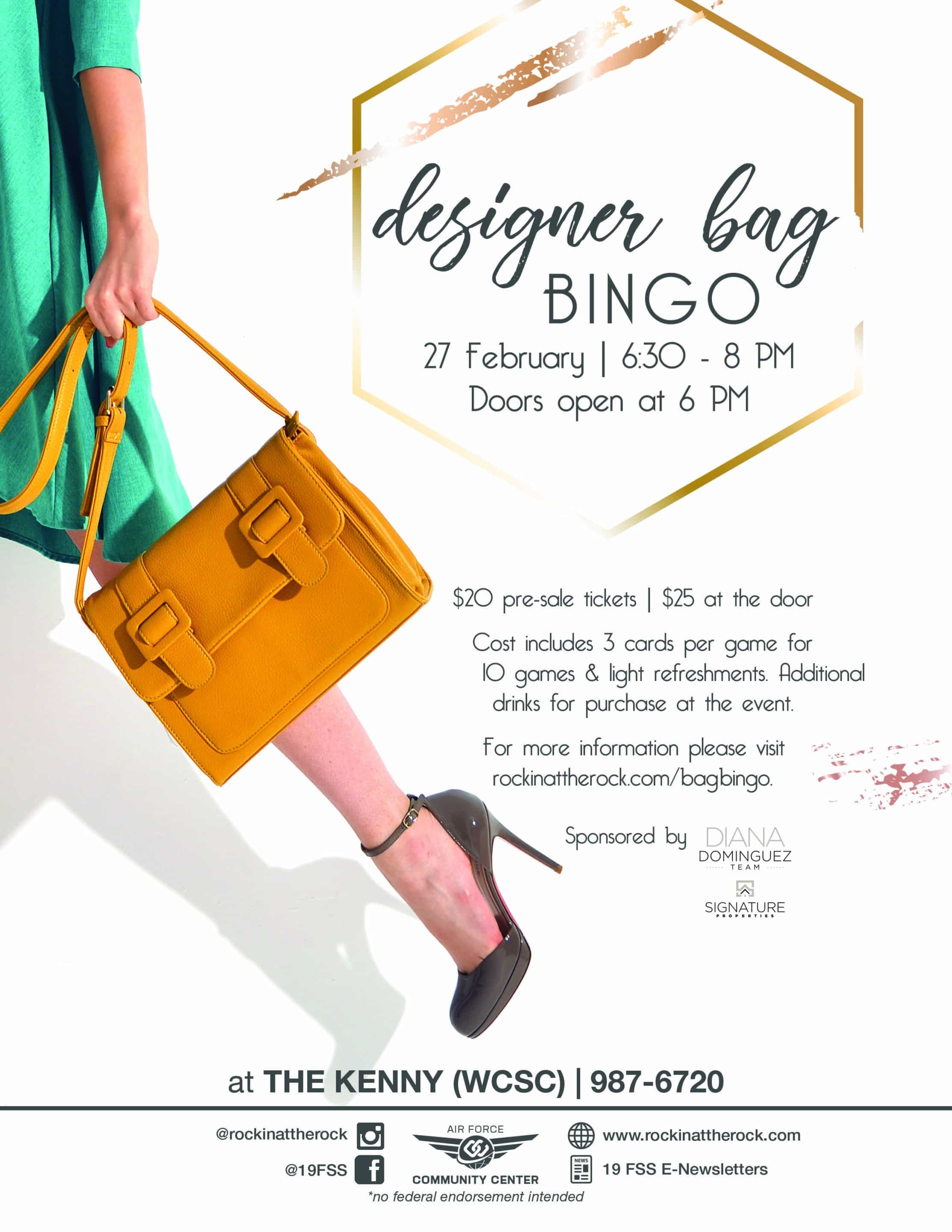Celebrate Valentineโs Day with Designer Bag Bingo at The Kenny. Doors open at 5:45 PM, games start at 6:30 PM. Play for 10 bingo bags and 4 door prizes. Tickets: $20 pre-sale / $25 at the door (includes 3 cards per game for 10 games). Tickets can be purchased from Hangar 1080 and ITT.