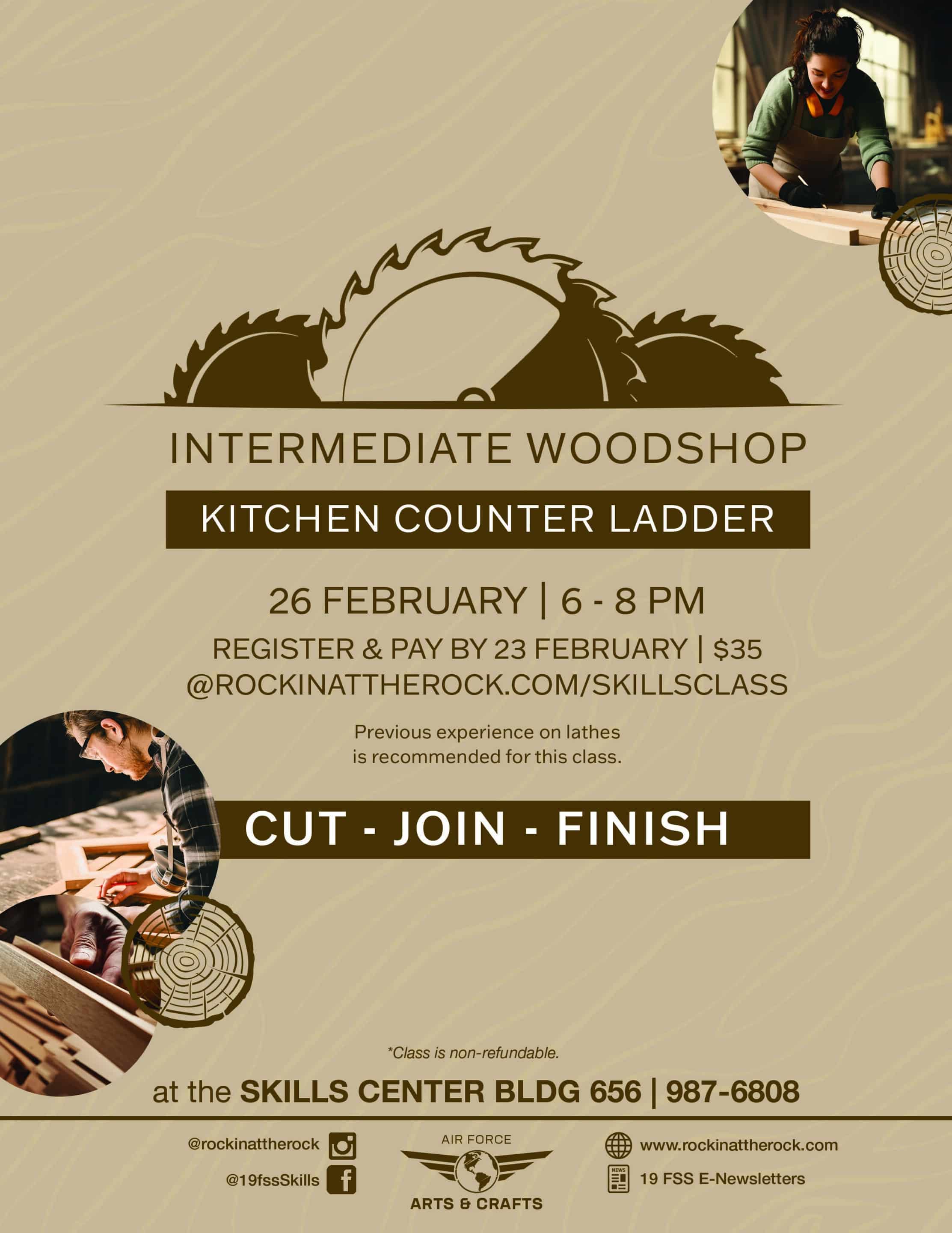 Create a small ladder-shaped countertop storage piece in this intermediate woodshop class. Cost: $35. Registration required by February 23, 2026. |