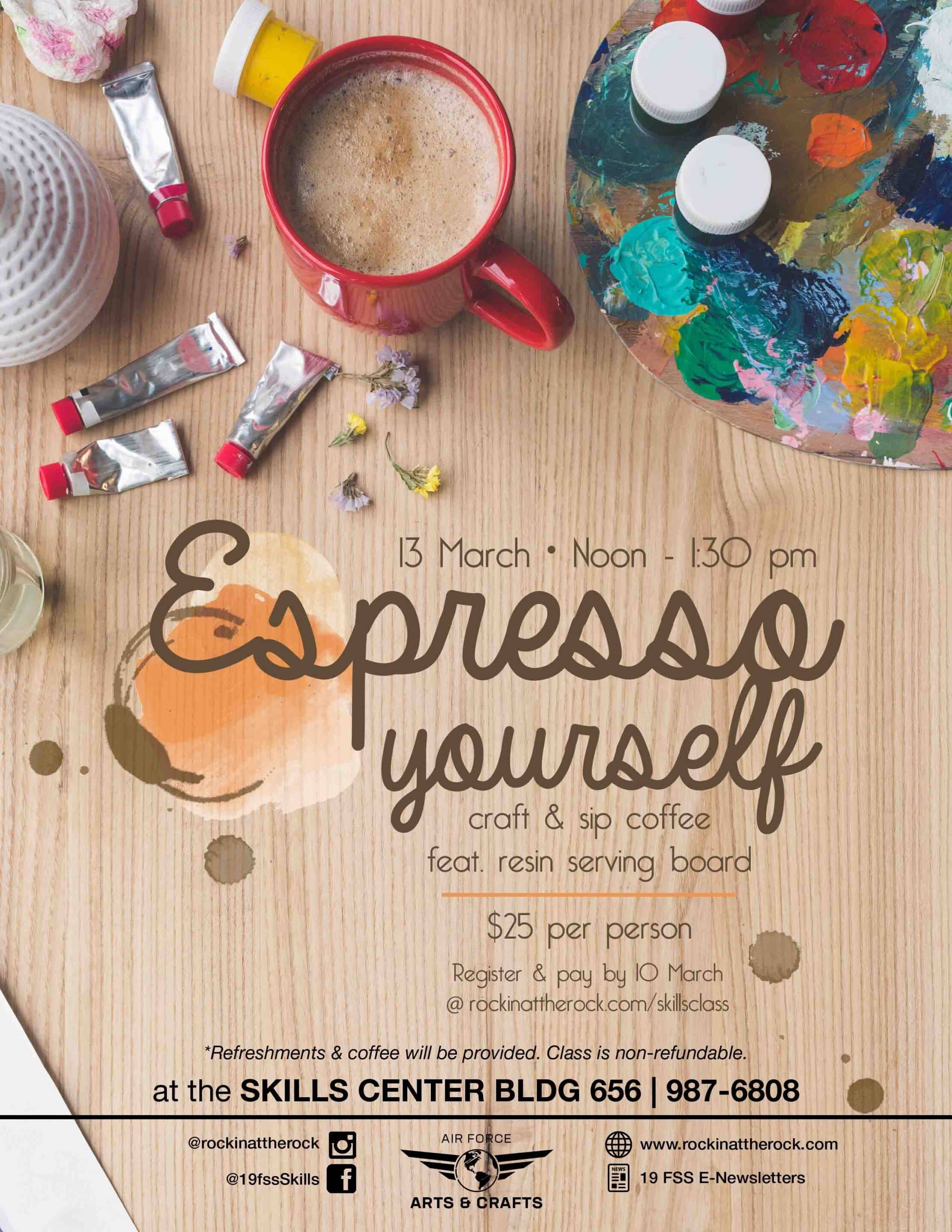 Make a one-of-a-kind serving board with a bamboo tray and colorful resin! Coffee and light refreshments will be provided. Registration deadline is March 10th. Cost is $25/person.