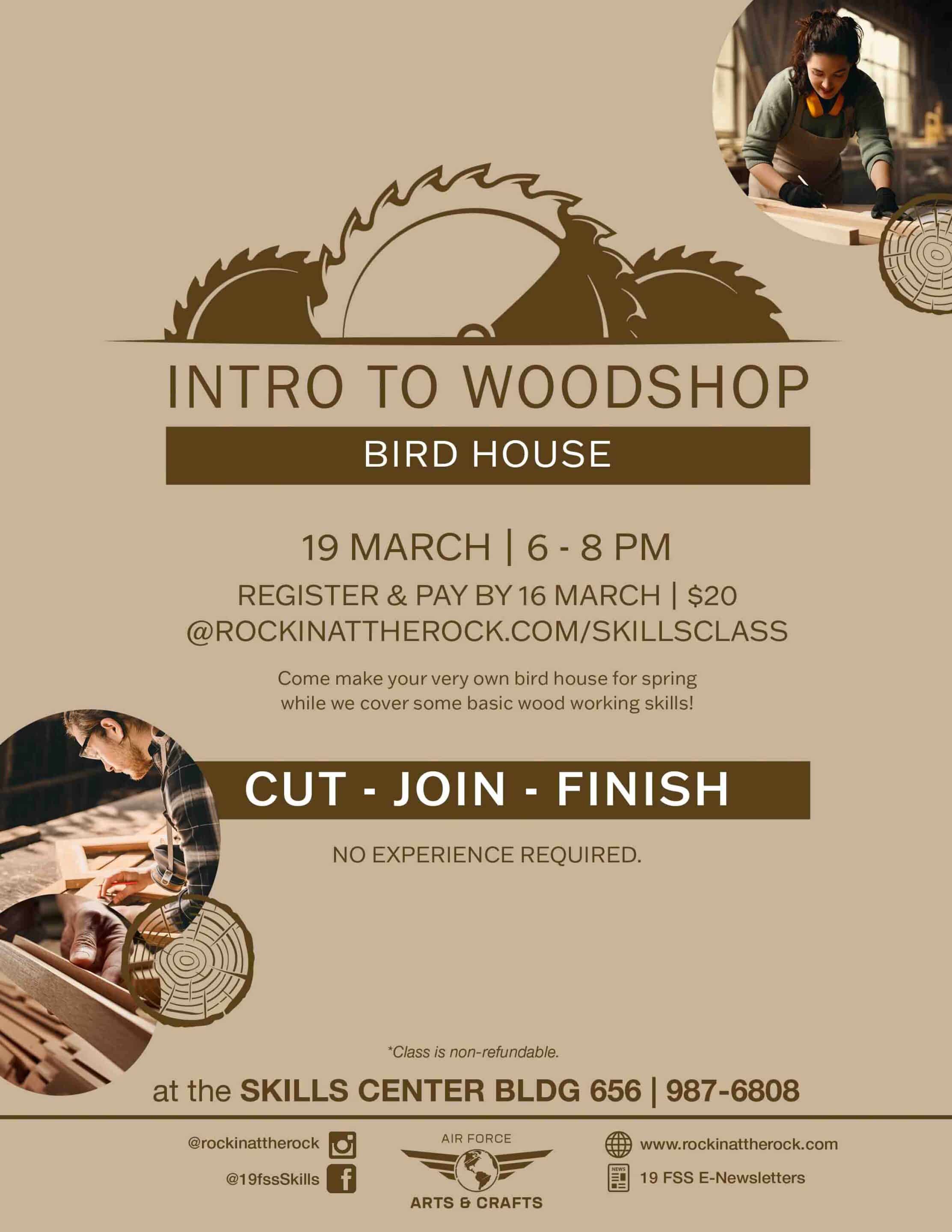 In this class we'll cover some basic wood working skills with the classic project of creating bird houses! Registration deadline is March 16th. Cost is $20/person. |