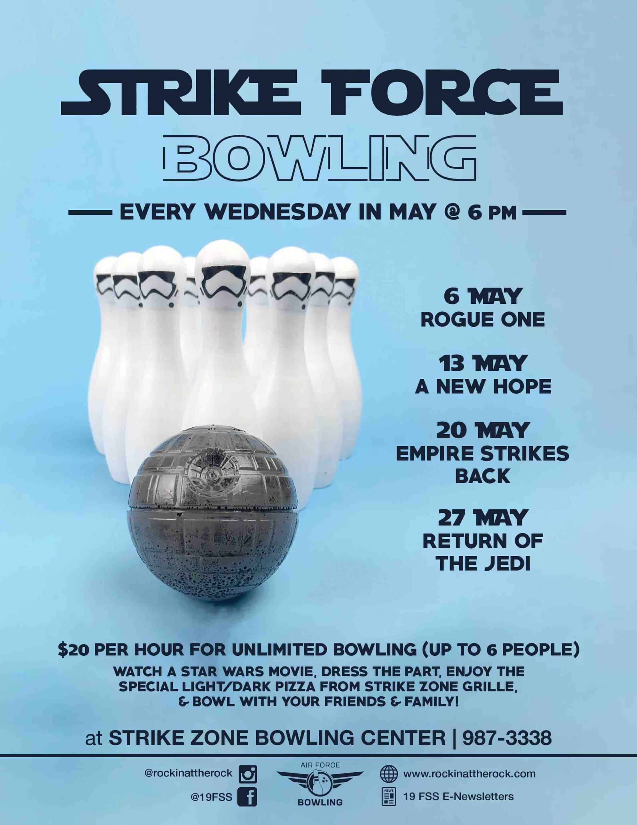 May the pins be with you! Join Strike Zone Bowling every Wednesday in May at 6 PM for Strike Force Bowling—a galactic night of bowling and Star Wars fun! Fuel up with the special Light Side/Dark Side Pizza from Strike Zone Grille Come dressed in your best Star Wars gear Enjoy unlimited bowling for just […] |